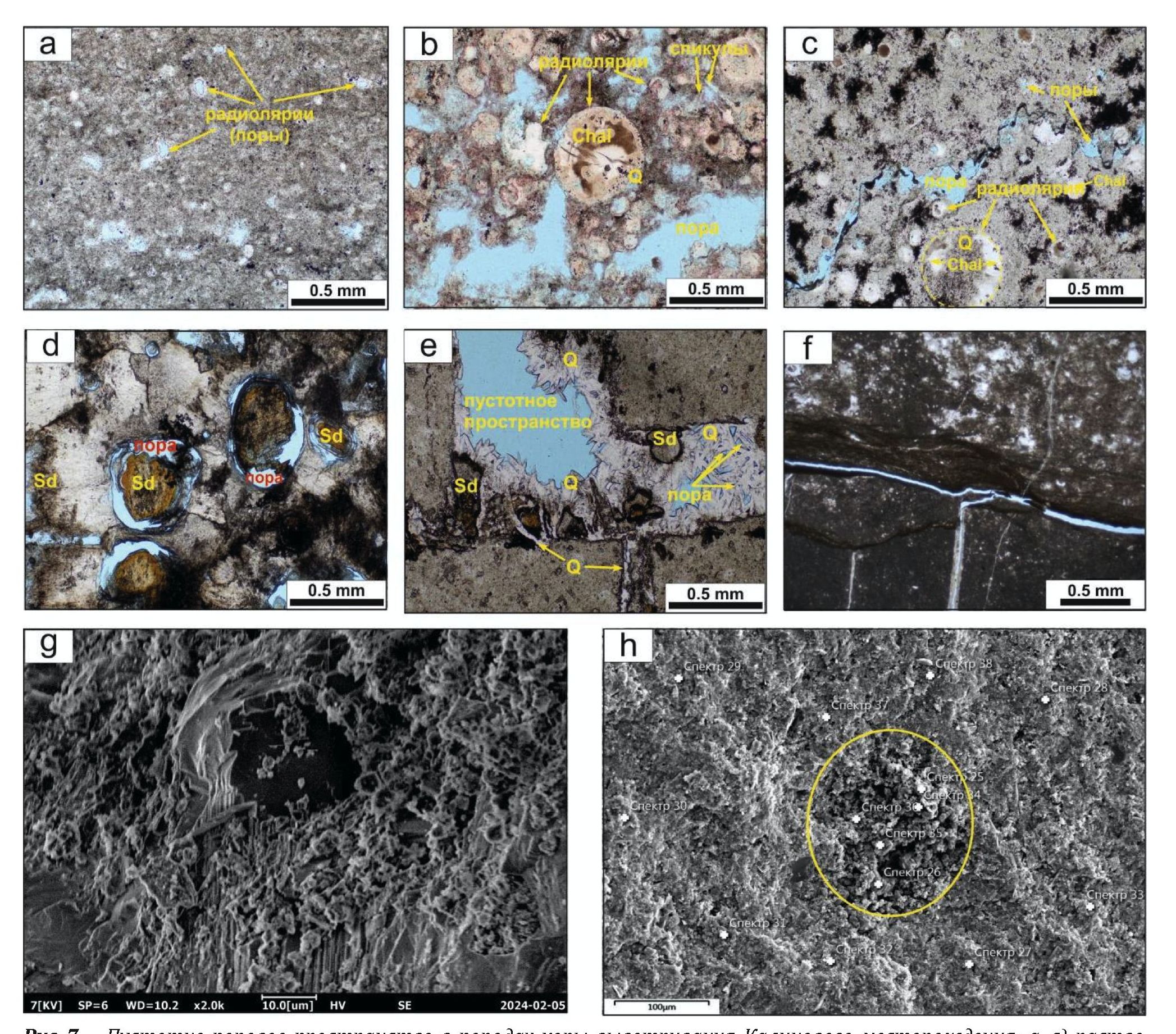 Рис. 7. Пустотно-поровое пространство в породах коры выветривания Калинового месторождения: a–с) растворение радиолярий с образованием пустот; d) пустоты выщелачивания радиолярий с заполнением кристаллическим сидеритом; e) микрокаверна в трещинах, частичная минерализация трещин по периферии кристаллами кварца и сидеритом; f) послойная открытая трещина на границе прослоев разного состава; g, h) СЭМ снимки глинисто-кремнистых пород, режим SE. Развитие глинистых минералов в породах, выщелачивание радиолярий (g) и метасоматическое развитие каолинита в участке породы (выделено желтым) (h). Фотографии шлифов a–f без анализатора. Усл. обозначения – на рис. 5
