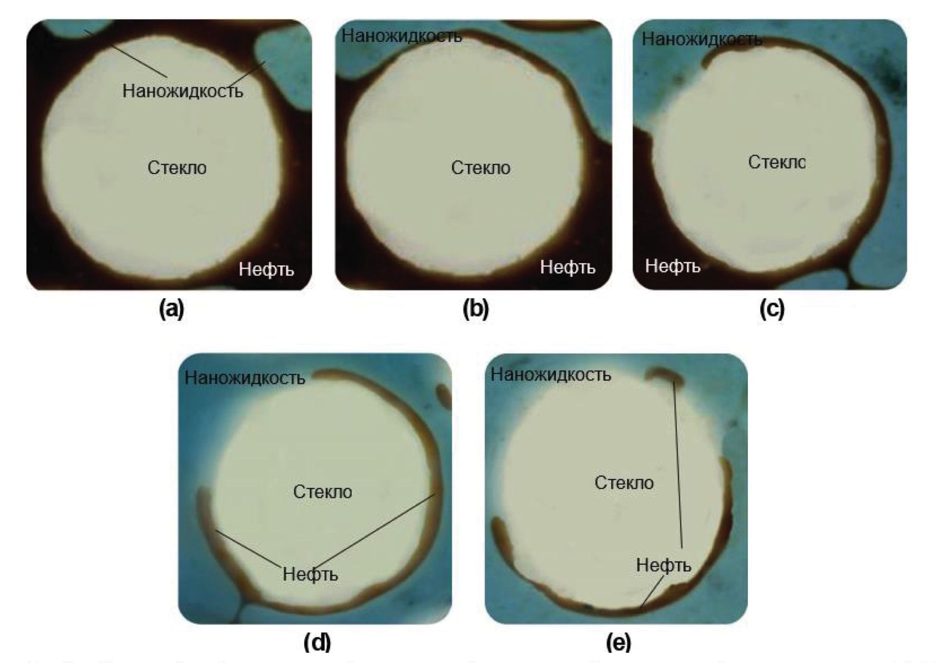 Рис. 2. Микромодели фильтрации нефти в масштабе пор при заводнении наножидкостью в течение: a) 0; b) 1000; c) 2000; d) 3000; e) 5000 секунд после воздействия наножидкостью на модель порового пространства [14]