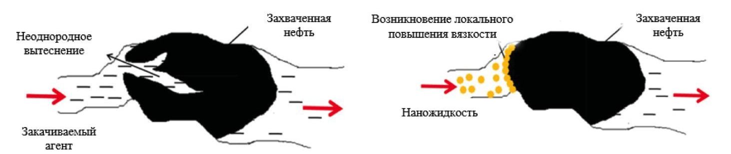 Рис. 5. Принципиальная схема различия фильтрации нефти в коллекторе под действием воды и наножидкости [18]