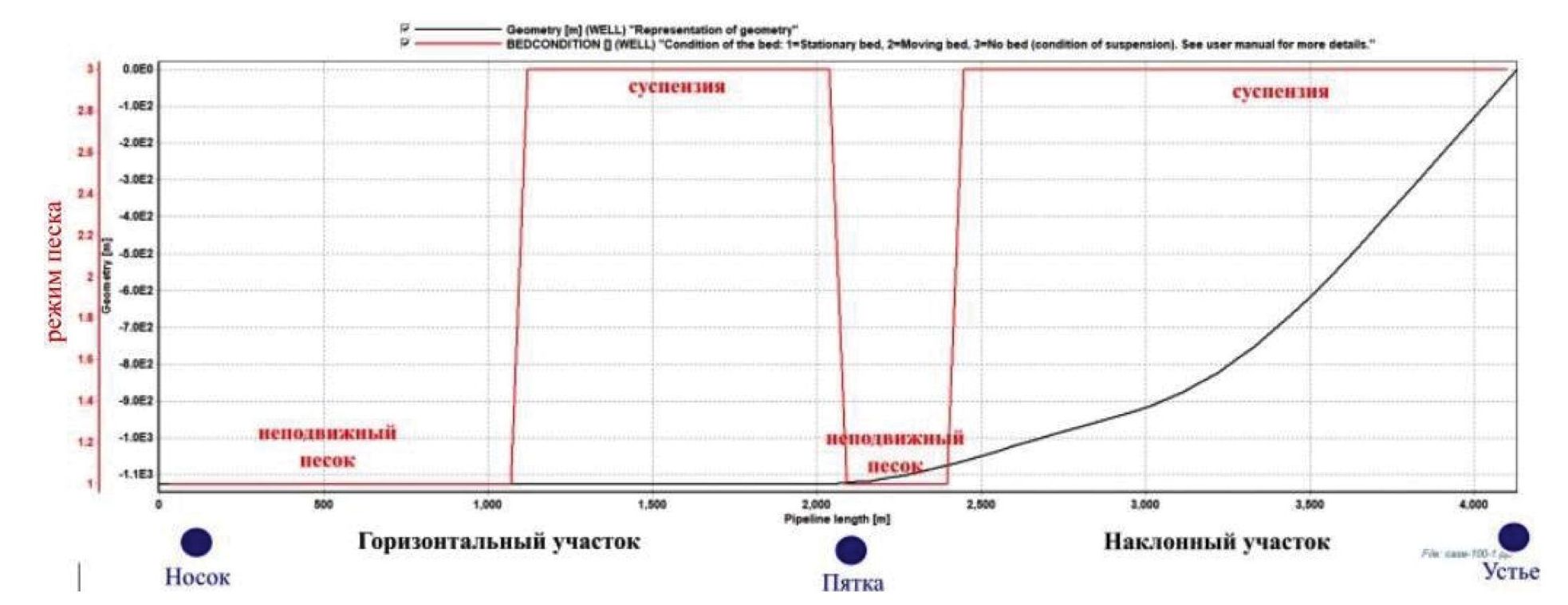 Высота песчаной пробки в эксплуатационной колонне составит ~50 м. В горизонтальном стволе длина участка, где накапливается песок, составит ~974 м (51 % длины продуктивного интервала).