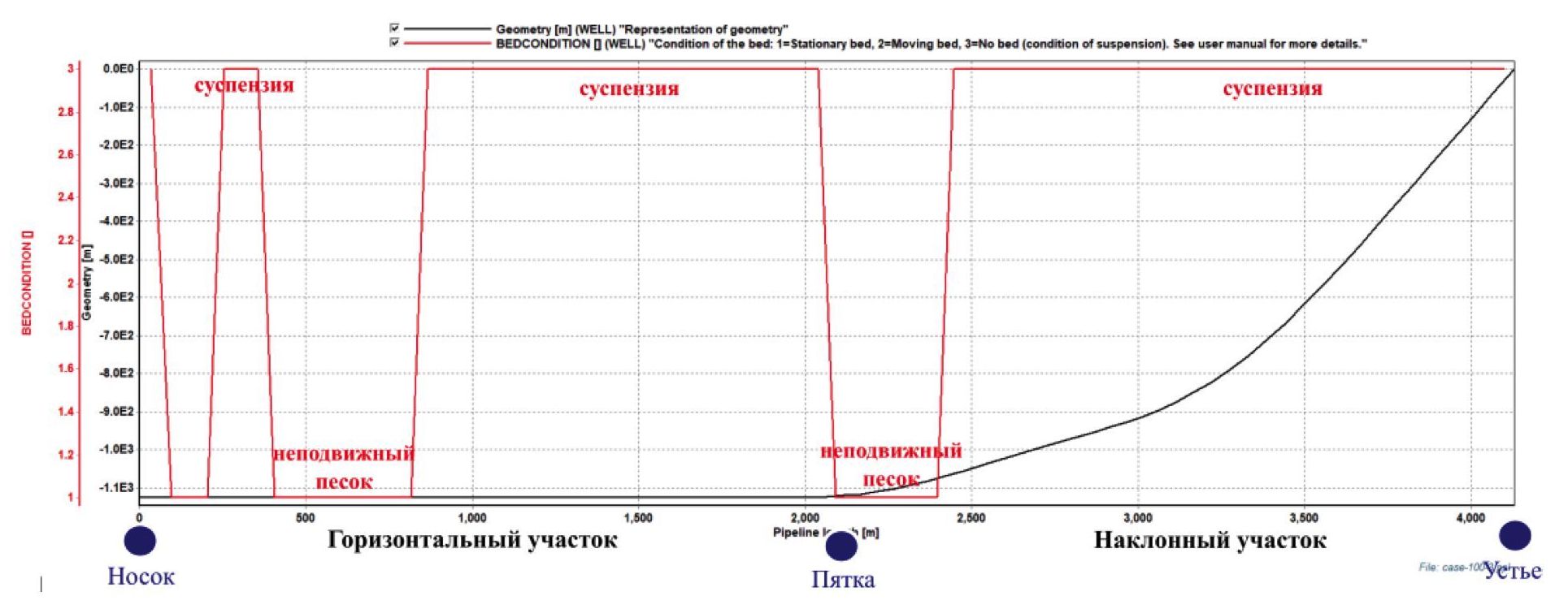 Для моделирования работы добывающей скважины с горизонтальным окончанием в условиях высокого выноса механических примесей необходимо предварительно составить модель флюида и модель скважины. Все расчёты проведены в динамическом симуляторе мультифазного потока OLGA, где есть модуль, позволяющий учитывать наличие твёрдых частиц [5–7].