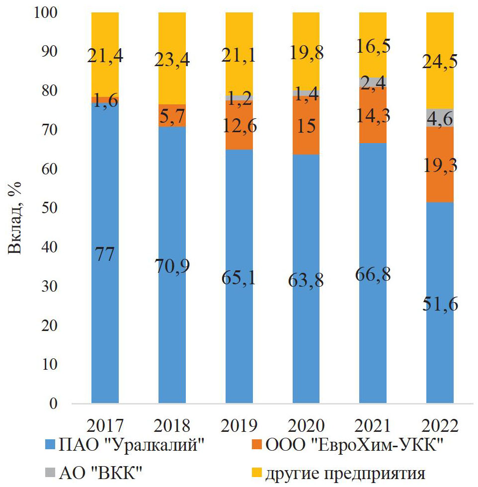 Согласно статистической отчетности Министерства природных ресурсов, лесного хозяйства и экологии Пермского края [25, 26], наибольший вклад в образование отходов по предприятиям в Пермском крае вносят предприятия калийной отрасли. На рис. 2 представлено процентное соотношение образования отходов в Пермском крае с 2017 по 2022 гг. по основным предприятиям.