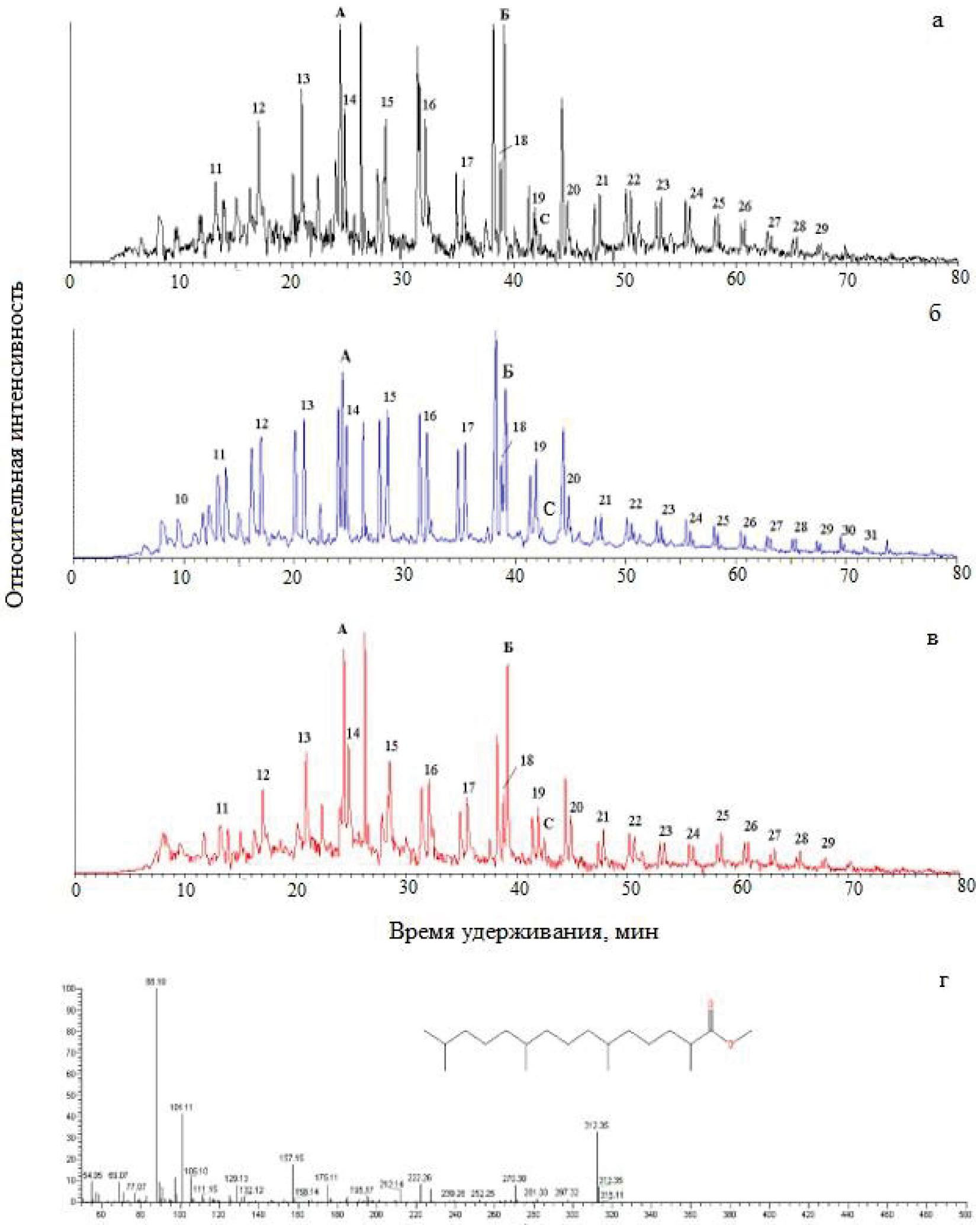 Fig. 2. GC-MS chromatogram at m/z for 88 products of RICO of high molecular weight asphaltenes of bituminous oils I (a), II (б), and III (в), where methyl esters of 2-methyl-substituted n-alkanoic acids are numbered from 10 to 31. A, B and C are methyl esters of isoprenoid acids and a mass spectrum of methyl ester of 2, 6, 10, 14-tetramethylpentadecanoic acid (peak B) (г)