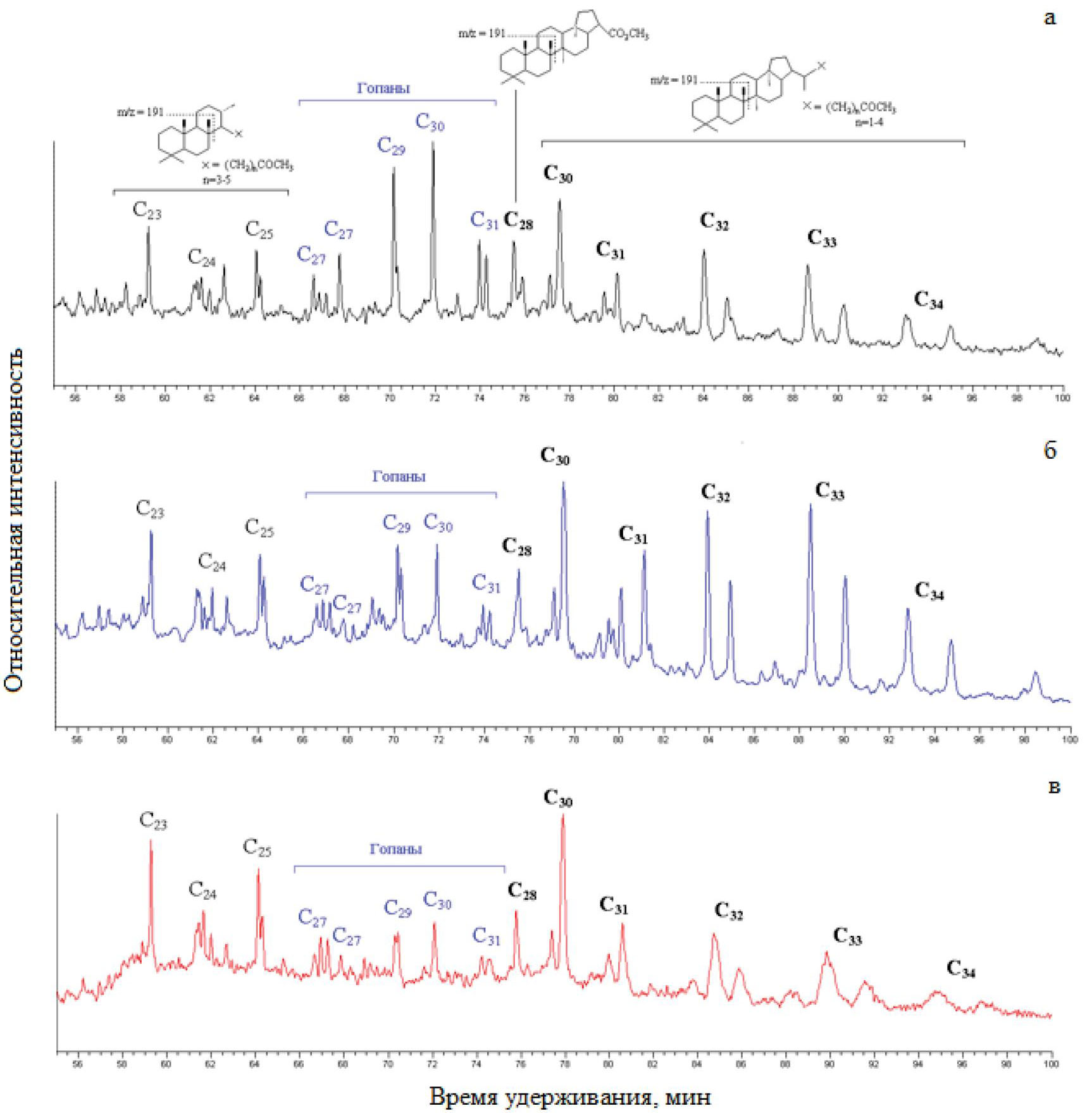 Fig. 4. GC-MS chromatograms at m/z of 191 products of RICO of high molecular weight asphaltenes of bituminous oils I (a), II (б) and III (в)