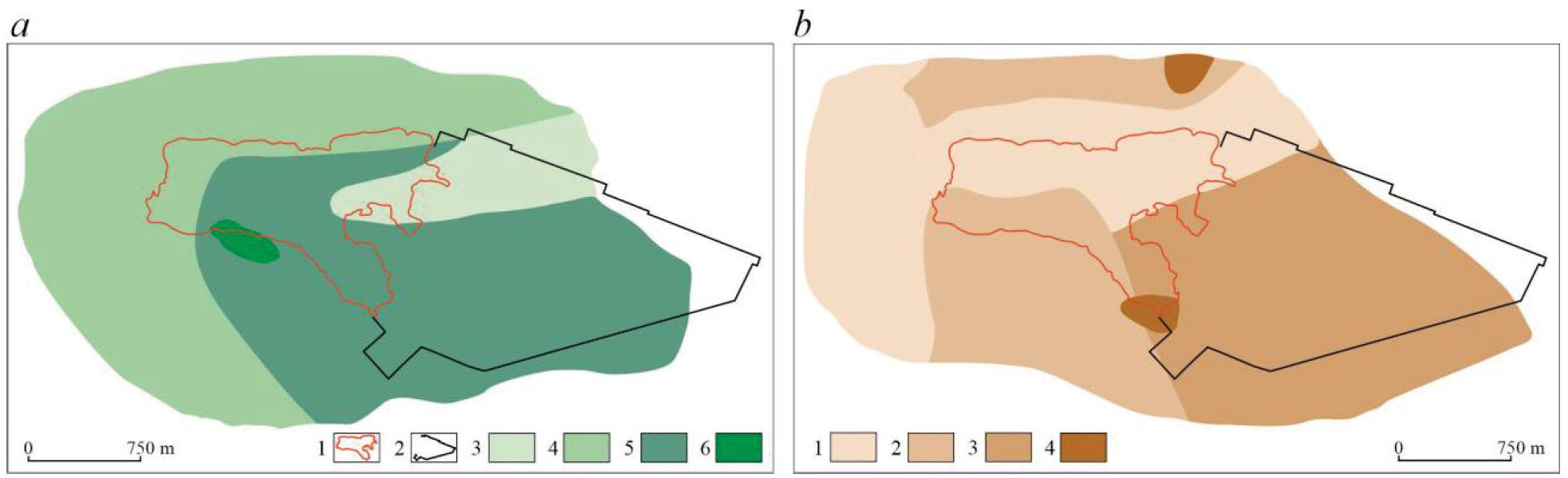 Fig. 2. Vertical permeability of impermeable horizons: a) Morainic impermeable horizon: 1 – PG dumpsite; 2 – industrial site area; vertical permeability (day–1): 3 – 0.00014–0.00016; 4 – 0.00031–0.00069; 5 – 0.0014–0.0036; 6 – 1.0 (hidrogeological openings); b) Paleogene silts, vertical permeability (day–1): 1 – 0.00001–0.00008; 2 – 0.00012–0.00013; 3 – 0.00033; 4 – 1.0 (hidrogeological openings)