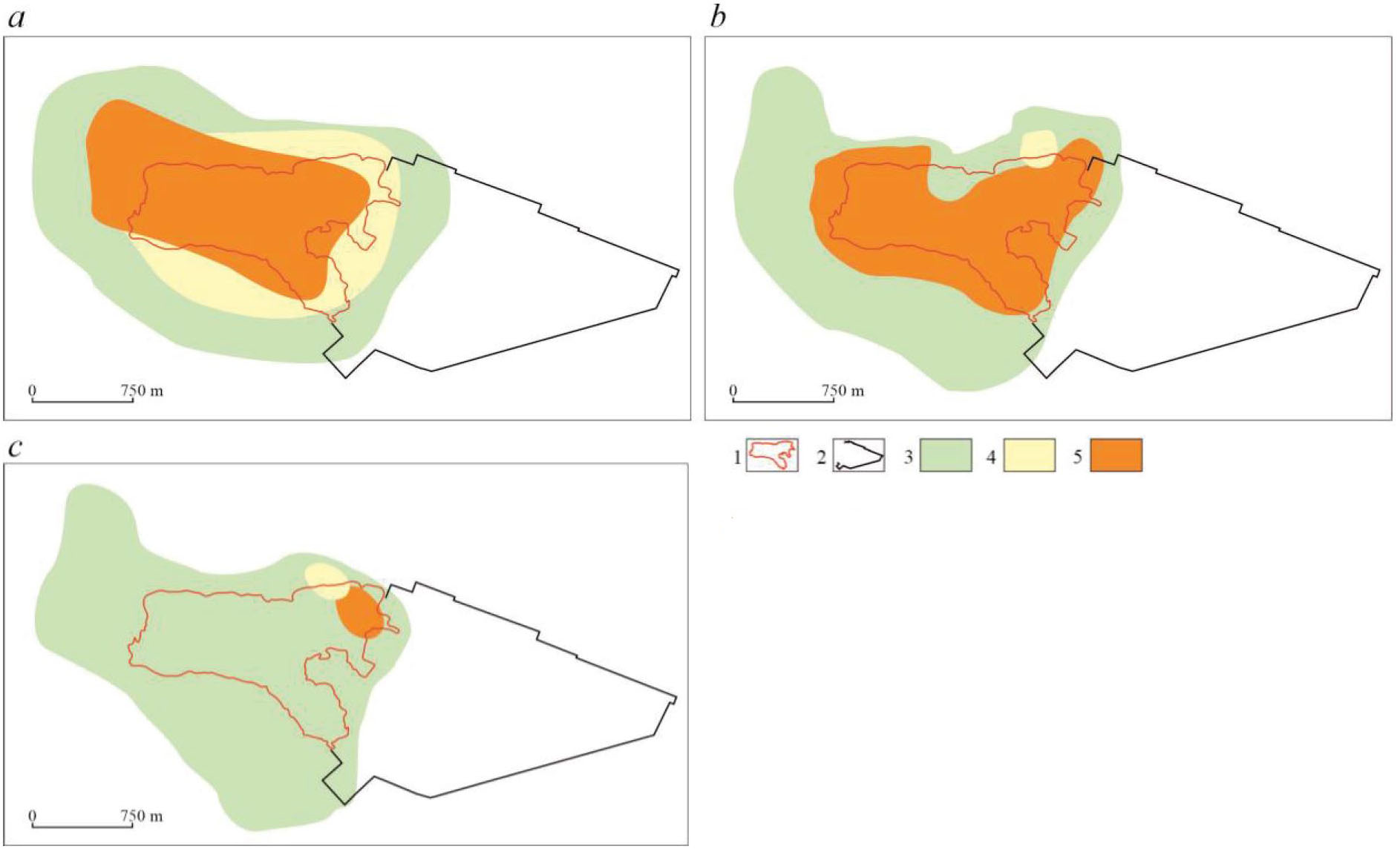Рис. 3. Загрязнение подземных вод: a) грунтовый водоносный горизонт; b) подморенный водоносный горизонт; c) палеогеновый водоносный горизонт; 1 – отвалы фосфогипса; 2 – промышленная площадка; степень загрязнения: 3 – низкая; 4 – средняя; 5 – высокая