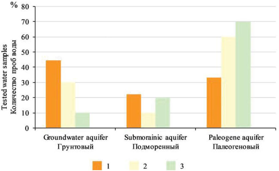 Thus, as it is prognosed, the highest level and density of contamination is found in the groundwater aquifer and is caused by insufficient insulation of the groundwater aquifer from percolation of contaminants from the ground surface (Fig. 4). In both submorainic and Paleogene aquifers, contamination is reduced considerably.
