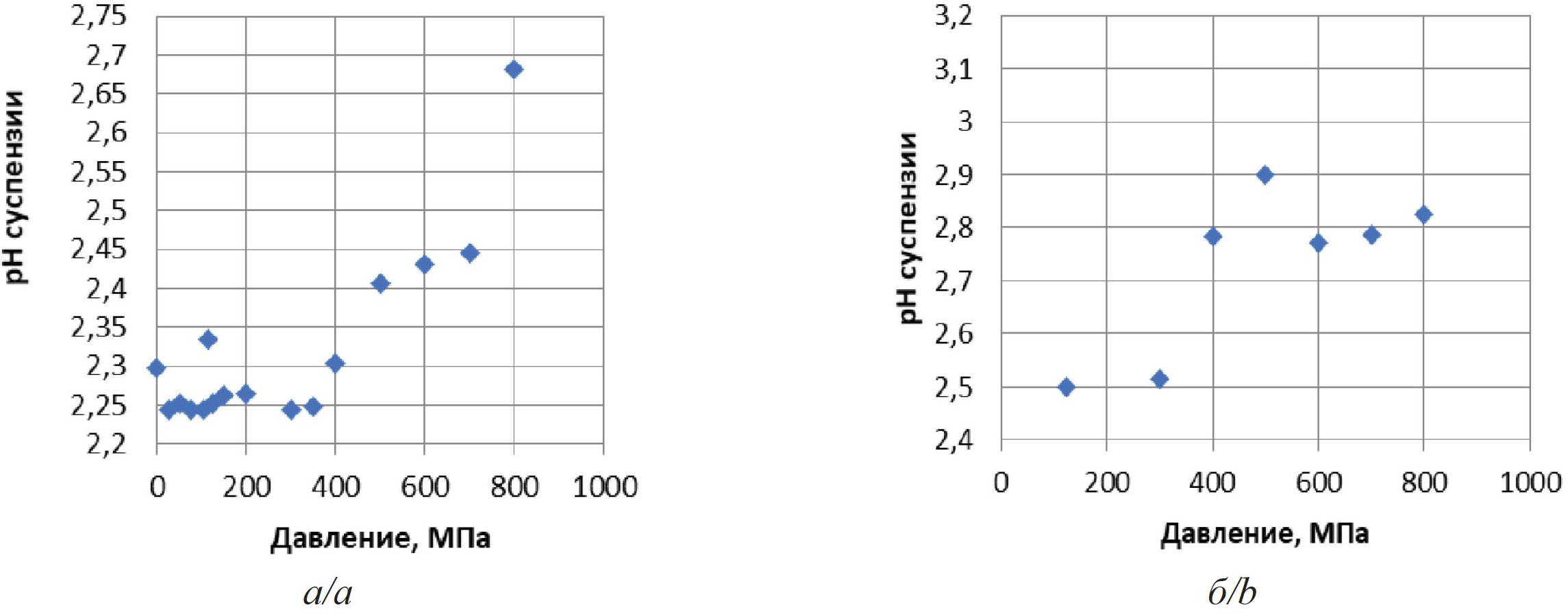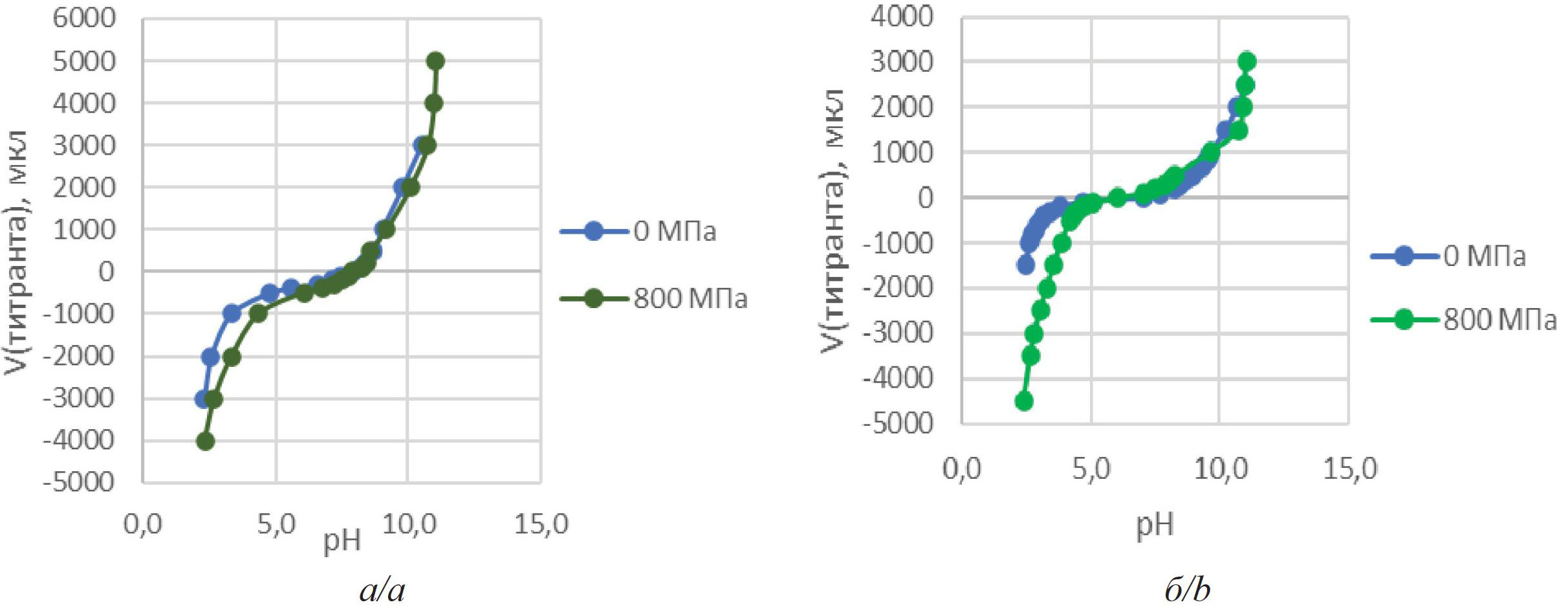 По данным значений рН в зависимости от объема титранта для каждого давления Р=0–800 МПа строились кривые титрования суспензий в программе SigmaPlot и определяли значение ТНЗ.