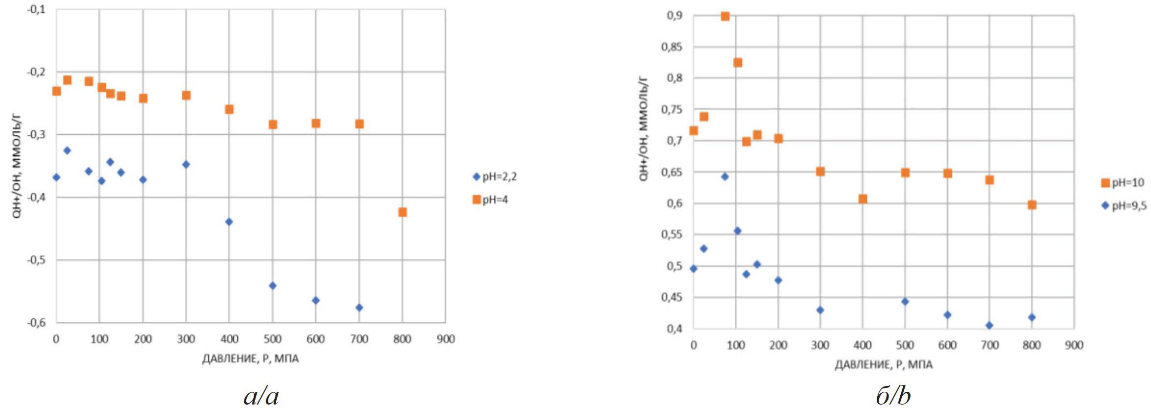 Рис. 5. Зависимость анионообменной емкости QH+/OH– бентонитовой глины от давления при рН=2,2 и рН=4 (а) и зависимость катионообменной емкости QH+/OH– бентонитовой глины от давления при рН=10 и рН=9,5 (б)