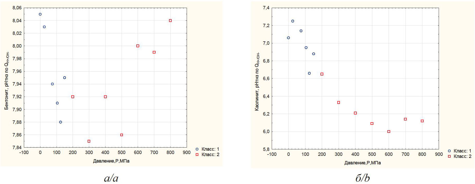 Экспериментальные данные по изменению водородного показателя суспензии каолиновой глины, обработанной давлением, в растворе KCl и дистиллированной воды показали, что при увеличении давления до 150 МПа (класс 1) наблюдается уменьшение величины водородного показателя, с увеличением давления от 200 до 800 МПа (класс 2) рН практически не изменяется.