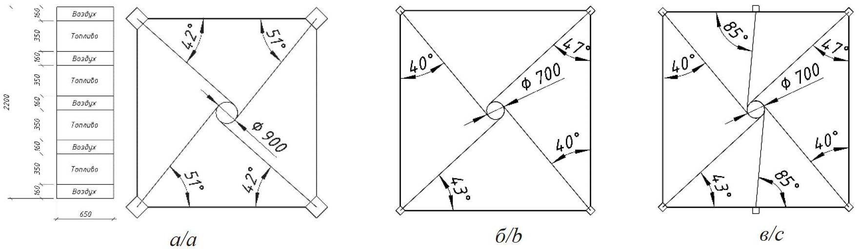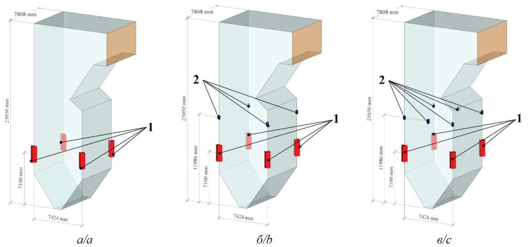 Горелки горизонтально-щелевые с чередованием каналов ввода первичного и вторичного воздуха (рис. 2, а). Для снижения генерации NOx рассмотрены схемы с установкой сопел третичного дутья выше основных горелочных устройств (рис. 2, б, в). Размеры сопел и высота их расположения рассчитаны согласно [13]. Сечение сопел составляет 286×572 мм, высота расположения – 11 986 мм, а диаметр условной окружности их ориентации – 700 мм.