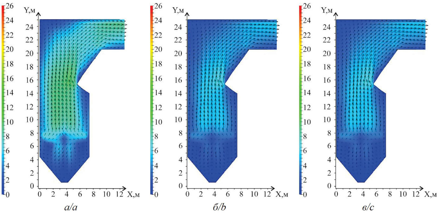 Аэродинамическая структура потока является основой стабильной работы котла, так как направление и величина скорости подачи первичного и вторичного воздуха важны для воспламенения угольной пыли, распространения пламени и теплопередачи в топке. Котлы с тангенциальной топкой характеризуются вращением газо-топливно-воздушного потока внутри топки. Этот поток, вращающийся вокруг вертикальной оси топки, улучшает смешивание воздуха с топливом и способствует сгоранию пылевидного угля, но может вызывать отклонения скорости и температуры, влияет на теплообмен в топочной камере и пароперегревателе. На рис. 3 показаны профили скорости газовой фазы по продольной оси топочной камеры в трех исследуемых вариантах.