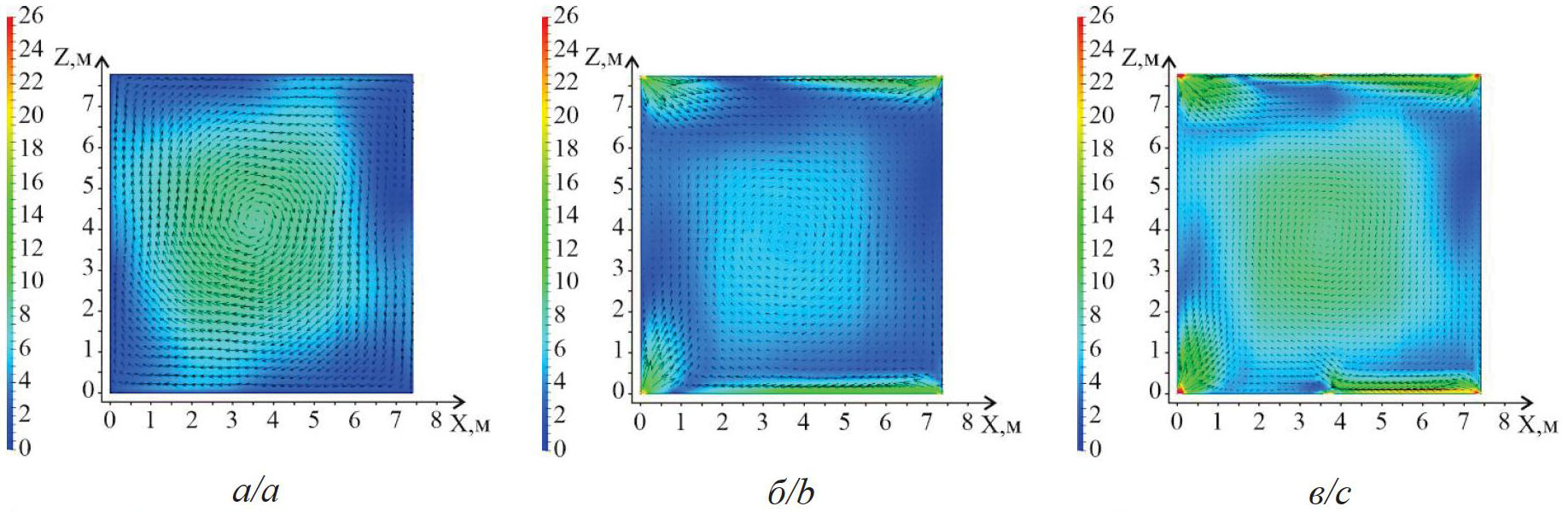 Рис. 4. Распределение скоростей (м/с) в горизонтальном сечении топочной камеры по оси горелок: а) базовая компоновка; б) с четырьмя соплами; в) с шестью соплами