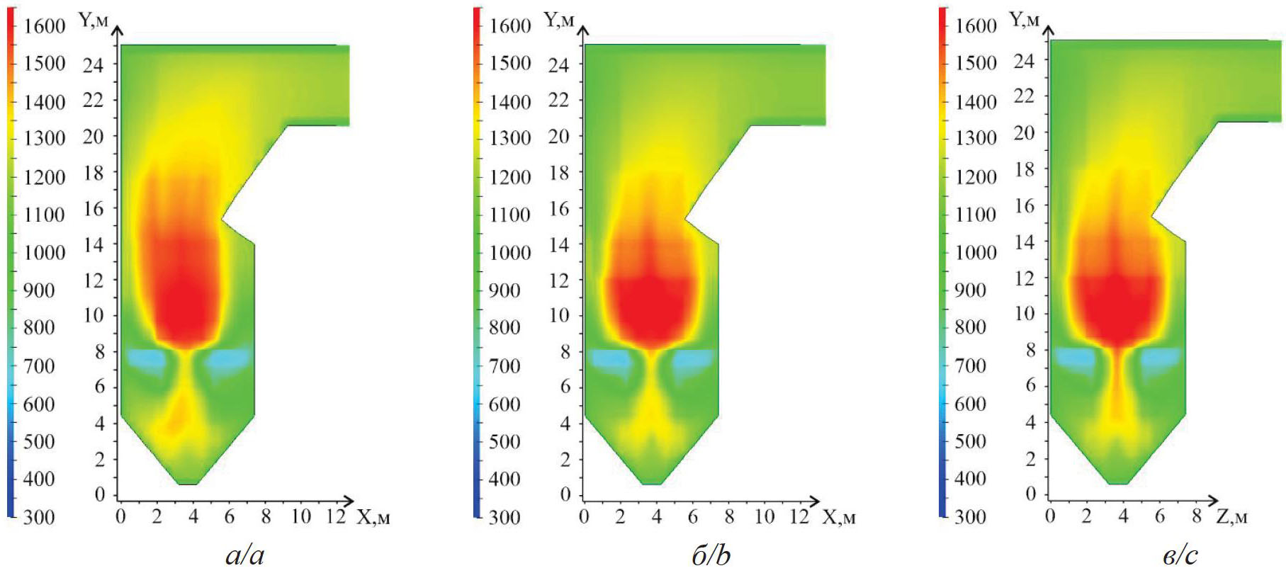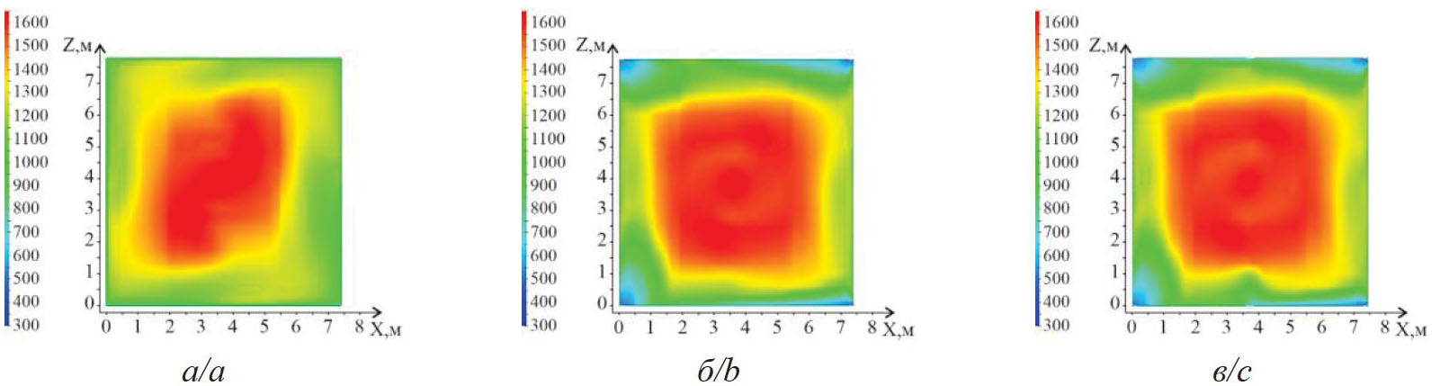 В соответствии с аэродинамикой топочной камеры в горизонтальной плоскости поля температур с максимальными значениями располагаются в центральной части топки в виде кольцевой структуры (рис. 7). При рассмотрении горизонтальных сечений на уровне расположения сопел третичного дутья можно выделить различие в конфигурации полей температур с наличием сопел третичного дутья и без них (рис. 7). В частности, при отсутствии сопел третичного дутья температурное поле имеет эллиптическую форму, вытянутую по одной из диагоналей топки (рис. 7, а). Это может негативно отразиться на равномерности обогрева стен топочной камеры, а также на шлаковании экранных поверхностей. При наличии сопел третичного дутья профиль высокотемпературного поля приближен к окружности и, соответственно, способствует более равномерному распределению температур по ширине и глубине топки (рис. 7, б, в).