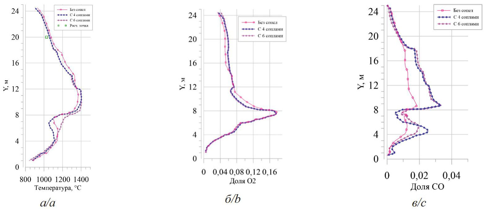 На рис. 8, в представлены профили концентрации CO по высоте топочной камеры для различных исследованных вариантов. Концентрация CO имеет противоположные профили кривых по отношению к О2. В топочной камере CO является промежуточным продуктом сгорания угольной пыли, который образуется в результате окисления угля и может вступать в реакцию с O2 и NOx. Соответственно в области с высоким содержанием О2 появляется низкое содержание СО.