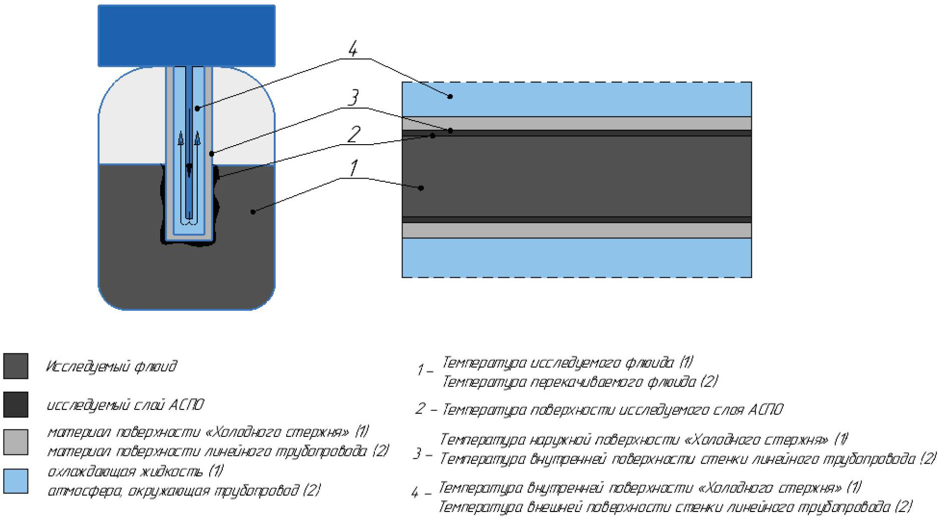 Исследования по оценке влияния частиц песка на количество отложений проводились на установке «Холодный стержень» [19, 20]. Данный лабораторный стенд используется для моделирования процесса образования АСПО во время движения нефти в лифтовой колонне или трубопроводе при заданных значениях температуры нефти и стенки. Температурный градиент в процессе исследования составлял 40 ℃. Скорость перемешивания нефти составляла 350 об/мин, что соответствует течению 70 /сут жидкости по трубопроводу с внутренним диаметром 62 мм. Принцип работы данной установки представлен на рис. 1.