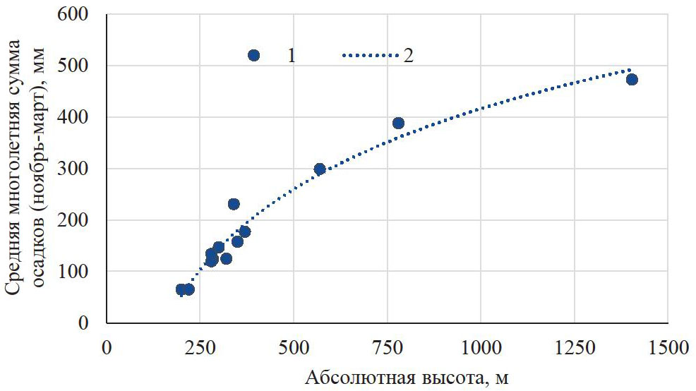 Рис. 3. График зависимости средней многолетней суммы осадков за ноябрь–март от абсолютной высоты осадкомерного поста (бассейн р. Амыл). 1 – средняя многолетняя сумма осадков; 2 – линия тренда y = 225,7ln(x) - 1142,9; R2 = 0,962, где x – абсолютная высота, м; y – среднемноголетняя сумма осадков (ноябрь–март), мм