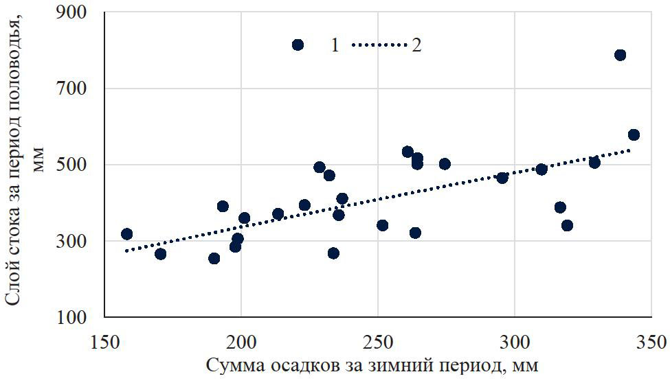 Слабая связь характерна для бассейнов рек Абакан и Сыда (коэффициенты детерминации R2 0,44 и 0,36 соответственно).