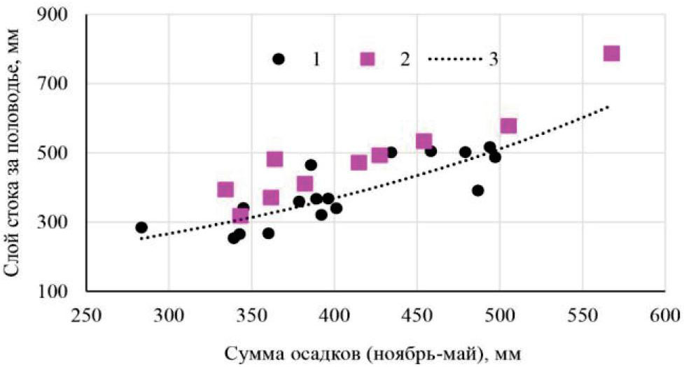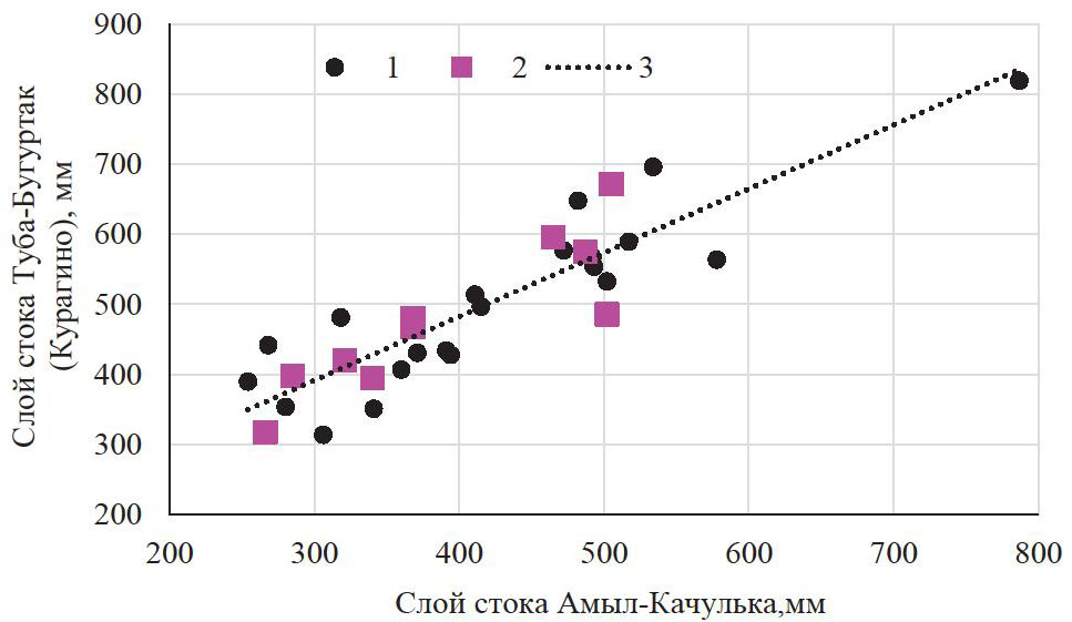 Fig. 7. Curve of relationship between flood runoff depth of the Amyl basin-analogy and Tuba River (1 – data for 1966–1986, 2 – 2008–2017, 3 – trend line y = 0,91x + 118,75; R2 = 0,797, where x is the runoff depth (mm) at the site Amyl–Kachulka; y is the runoff depth (mm) at the site Tuba r.–Bugurtak vill. (Kuragino)