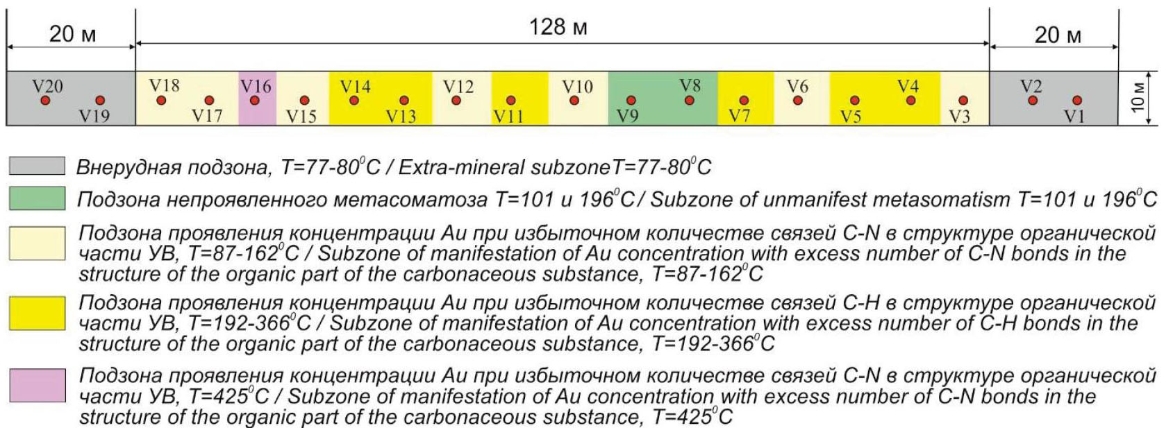 В связи с этим в рудной зоне были установлены подзоны концентрации Au, обусловленные температурной зональностью в виде проявления локального метасоматизма, на который оказывал влияние белково-жировой состав растений – образователей УВ.
