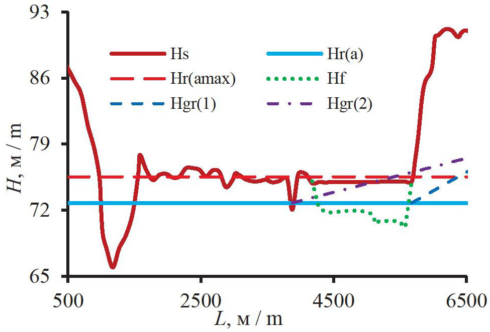 Рис. 2. Поперечный профиль долины р. Оби у с. Мельниково [27, 46]; условные обозначения: L – расстояние от условной точки на левом берегу; уровни воды H в Балтийской системе высот: Hs – высотная отметка поверхности долины или дна р. Оби; Hr(a) и Hr(amax) – среднемноголетний и средний максимальный уровни воды р. Оби за 1967–2015 гг.; Hf – нижняя граница Обского болота; Hgr(1) и Hgr(2) – расчетные отметки кривой депрессии подземных вод от среднемноголетнего уровня воды в скважине 63р до внешней границы болота (1) и среднего уреза воды в протоке Оби (2)
