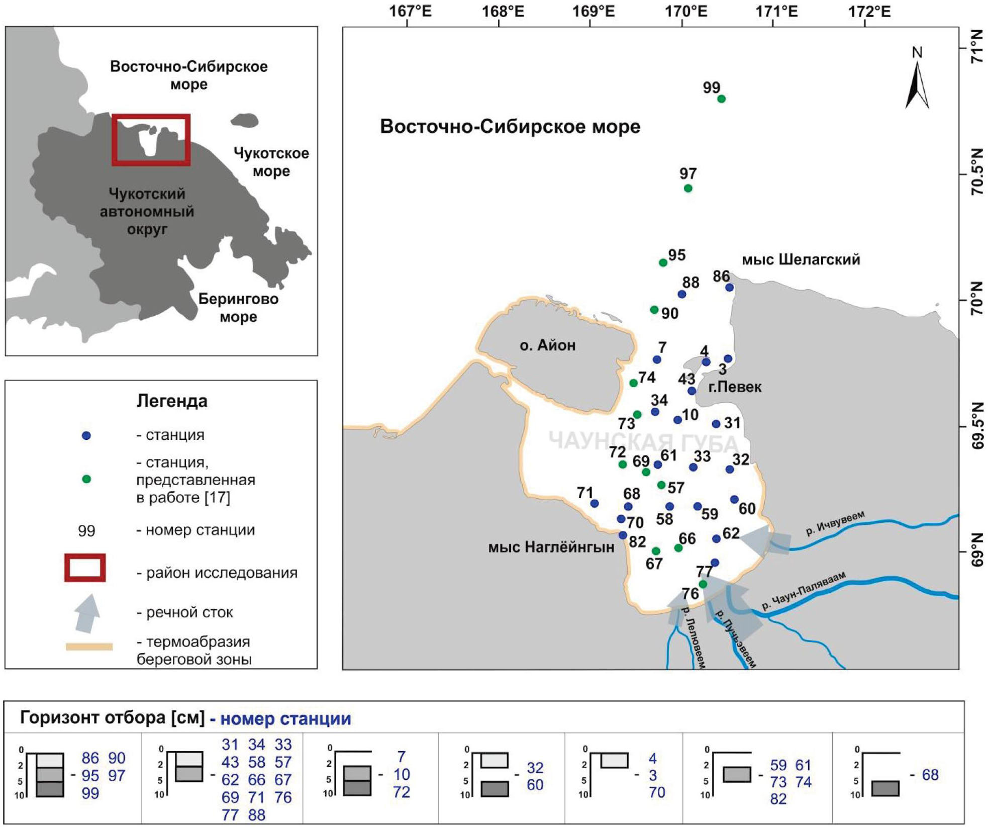 Рис. 1. Карта станций отбора проб в Чаунской губе и в прибрежных районах Восточно-Сибирского моря