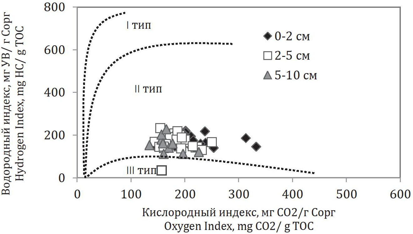 Рис. 4. Модифицированная диаграмма Ван-Кревелена для поверхностных осадков Чаунской губы (Восточно-Сибирское море)