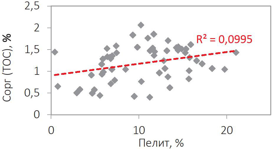 Рис. 6. Взаимосвязь параметра Сорг и доли пелитовой фракции в осадках