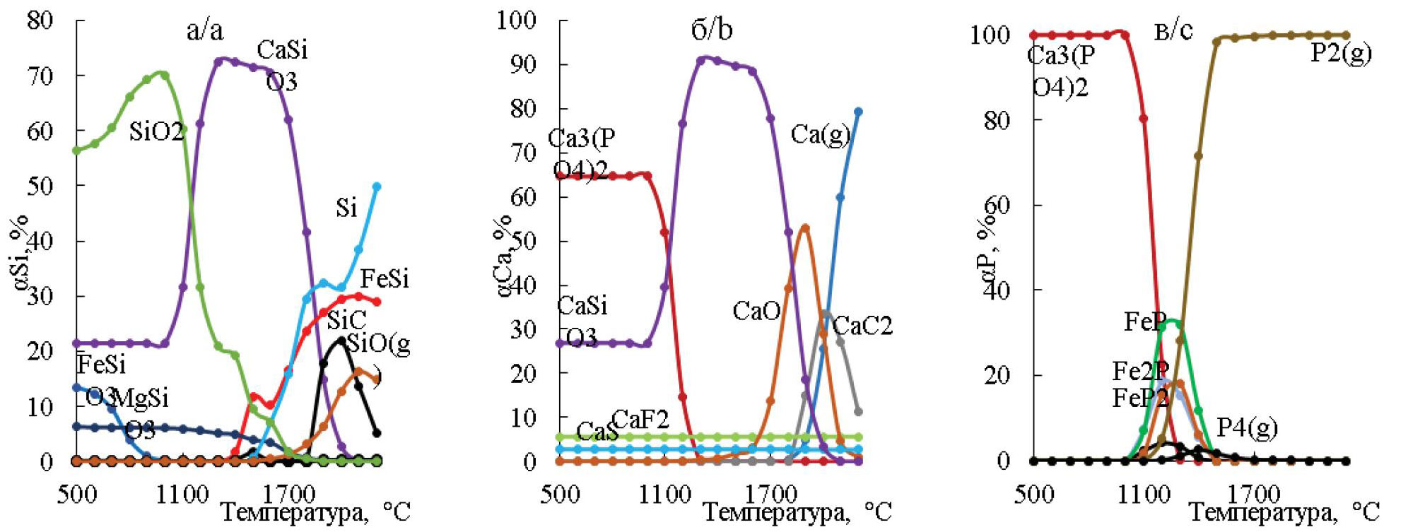 Из рис. 2 видно, что силициды железа образуются при температуре более 1220 °С, степень перехода кремния в FeSi–αSi(FeSi) составляет 23,42 % при 1900 °С. Переход αSi(Si) наблюдается при температуре более 1300 °С, возрастая до 46,04 % при 2200 °С. При температуре более 1700 °С αSi(SiC) возрастает, достигая максимума (37,5 %) при 1900 °С. Максимум перехода кальция в карбид кальция отмечается при 2000 °С и составляет 41,45 %. Начиная с 1070 °С фосфор переходит в газовую фазу, достигая 100 % при 1600 °С. В температурном интервале от 1070 до 1390 °С фосфор переходит в фосфиды железа.