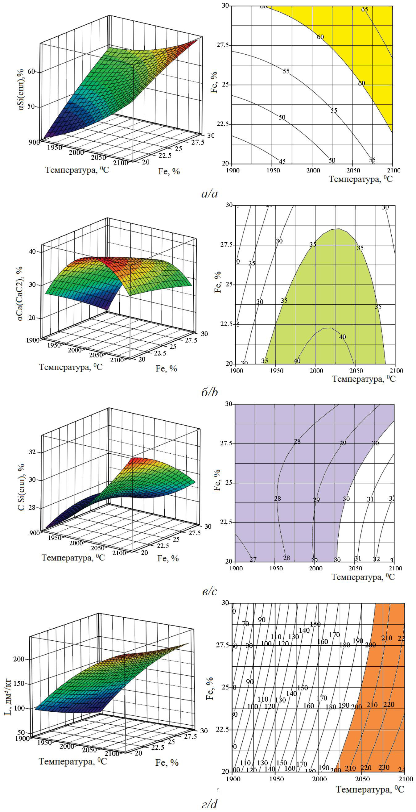 Рис. 6. Объемные и плоскостные изображения влияния температуры и количества железа на αSi(спл) (а), С Si(спл) (б), αСа(СаС2) (в) и L, дм3/кг (г)
