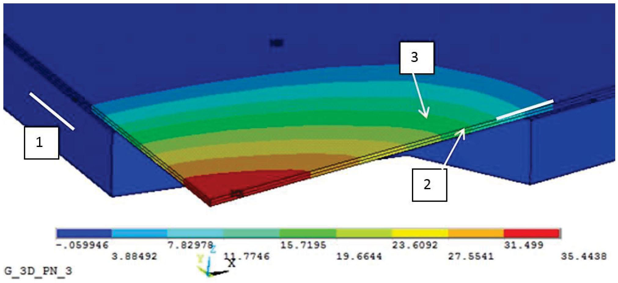 Сам фундаментный блок, который осуществляет поднятие коренных пород, не рассматривается, его действие заменяется давлением на внутренней поверхности нижнего слоя коренных пород (рис. 1, область 2), которое повышалось поэтапно. Принятое допущение приводит к «сводовой» форме вышележащих отложений (поднятие под действием давления пластичных пород), что и наблюдается в исследуемой структуре.