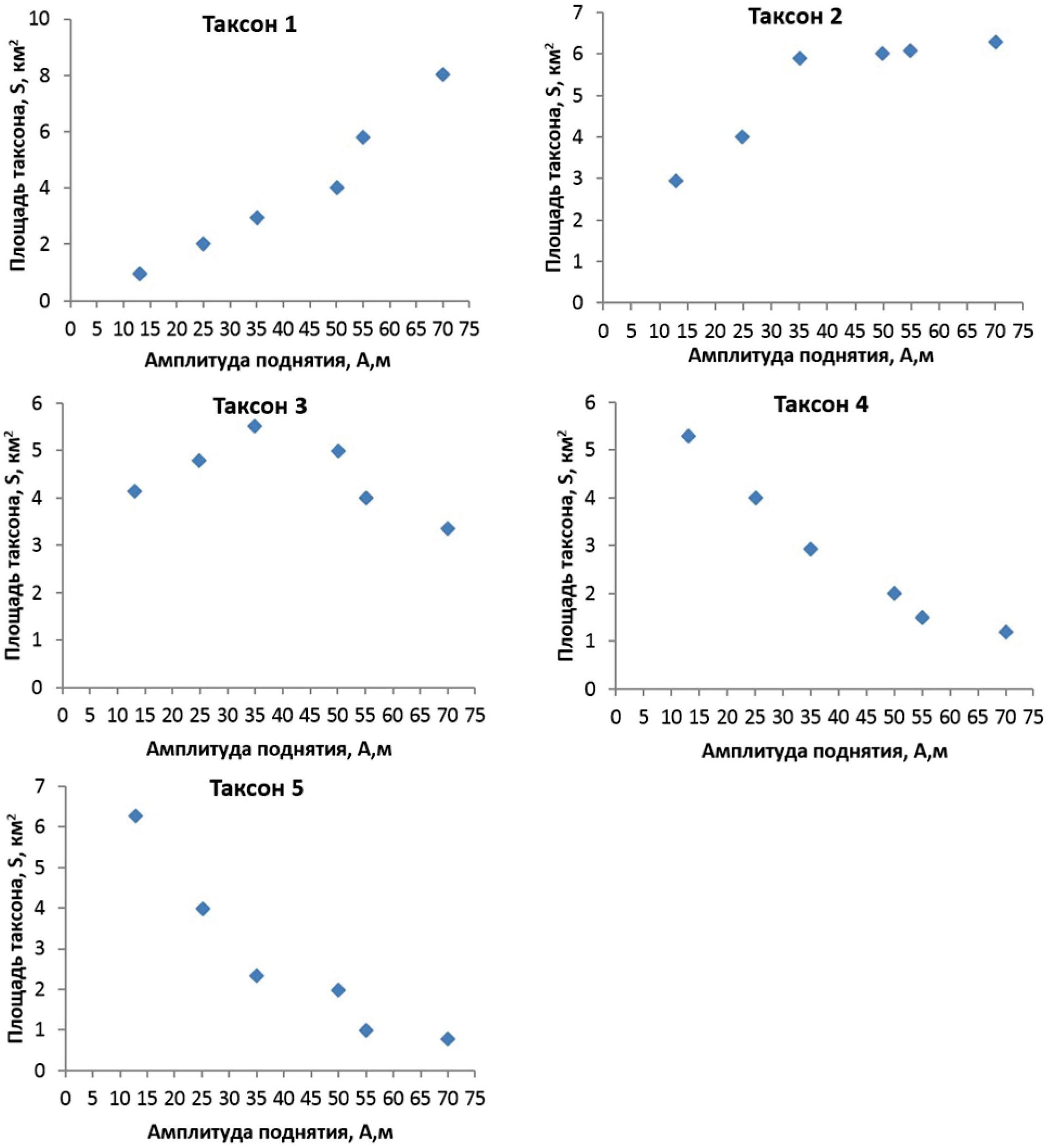 Используя данные табл. 3, построены графики зависимости площади таксонов от амплитуды поднятия локальной структуры (рис. 3).