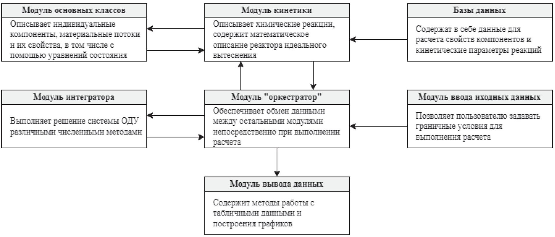 В модуле основных классов описаны методы расчета термодинамических свойств индивидуальных компонентов (теплоемкость по уравнению DIPPR 107 [6] и энтальпия интегрированием от энтальпии образования в стандартных условиях) и их смесей. На каждом шаге расчета изменяется состав реакционной смеси и, соответственно, плотность, и объемный расход смеси. Для расчета термодинамических свойств потока на данном этапе используется уравнение состояния идеального газа. Результатом работы модуля основных классов являются рассчитанные термодинамические свойства чистых компонентов и затем многокомпонентного потока на каждом шаге интегрирования.