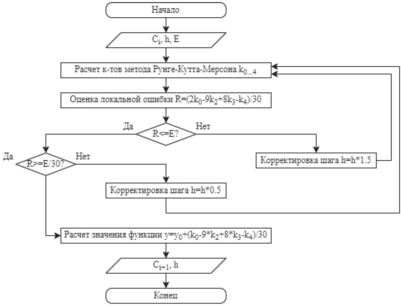 Алгоритм выбора шага интегрирования на каждой итерации приведен на рис. 2. Алгоритм основан на методе Рунге–Кутты–Мерсона [8, 9] и упрощен в части расчета величины нового шага.