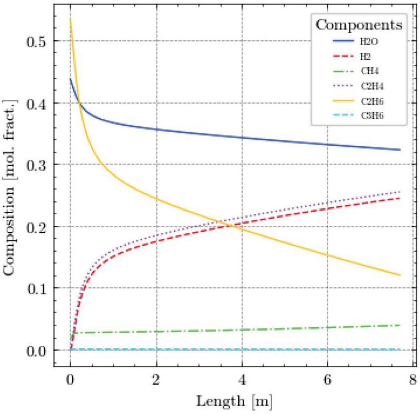 Таким образом, была разработана математическая модель реакционного змеевика пиролиза, показывающая удовлетворительные результаты при сравнении с данными фактического пробега (до 11 % по основным компонентам). Для повышения точности расчетов и возможности применения модели для оптимизации работы оборудования необходима доработка кинетической модели, реализация расчета потерь давления по змеевику и теплообмена с дымовыми газами.