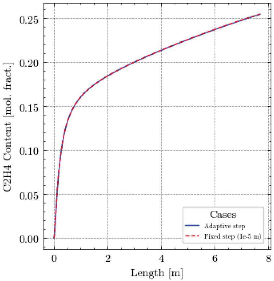 Разницы в профилях концентраций между результатами, полученными с применением фиксированного и адаптивного шага, нет. В этом можно также убедиться сравнив профили концентраций одного из компонентов, полученные в двух расчетах, – например, этилена – на одном графике (рис. 4).