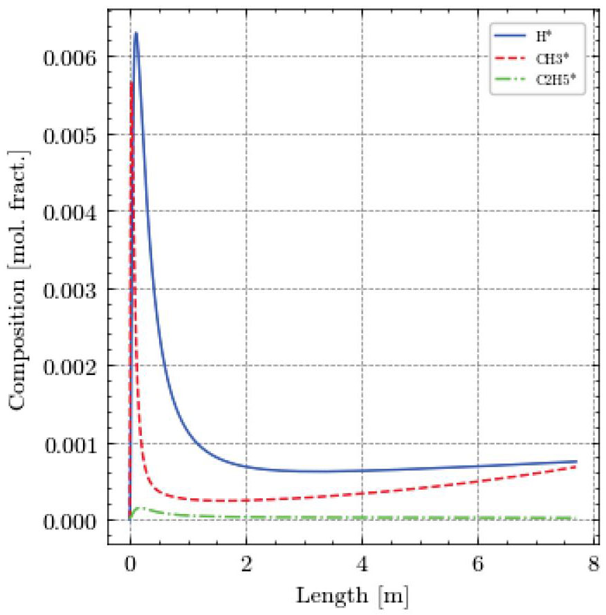 При этом форма профилей концентраций компонентов соответствует общепринятому представлению о кинетике процесса пиролиза. Это хорошо видно на примере профилей концентраций радикальных компонентов (рис. 5) – явно прослеживаются зоны инициации реакций, продолжения реакций и обрыва цепи реакций.