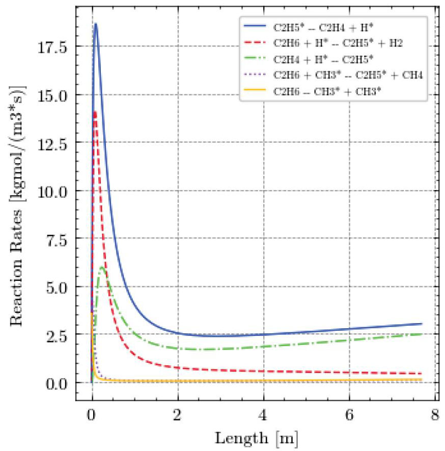 C2H6→CH3*+CH3* | 4,0∙1016 | 365,84 | C2H4+H*→C2H3*+H2 | 8,0∙1011 | 16,71 |