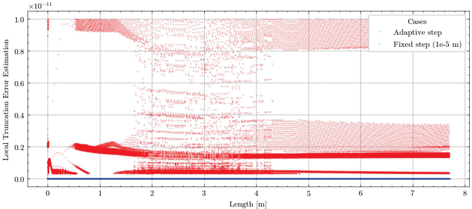 При этом из рис. 8 также видно, что минимальный шаг, который выбирает алгоритм, на некоторых участках составляет порядка 2∙10–5 м, что не позволяет сократить время расчета при использовании фиксированного шага простым увеличением шага интегрирования. Так, расчет данной задачи с шагом интегрирования 10–4 м не позволяет свести материальный баланс расчетной ячейки уже после 0,3 м змеевика.