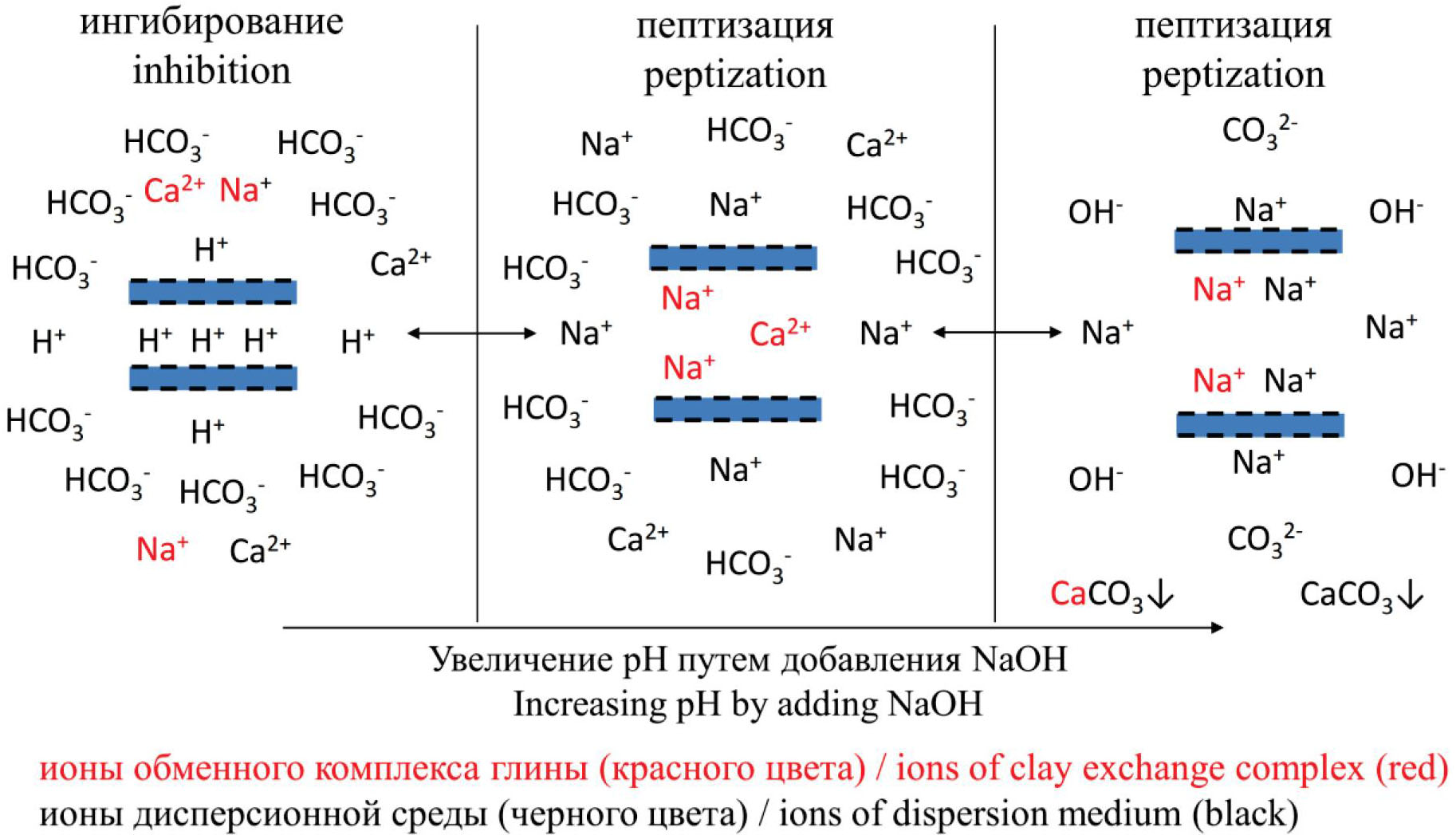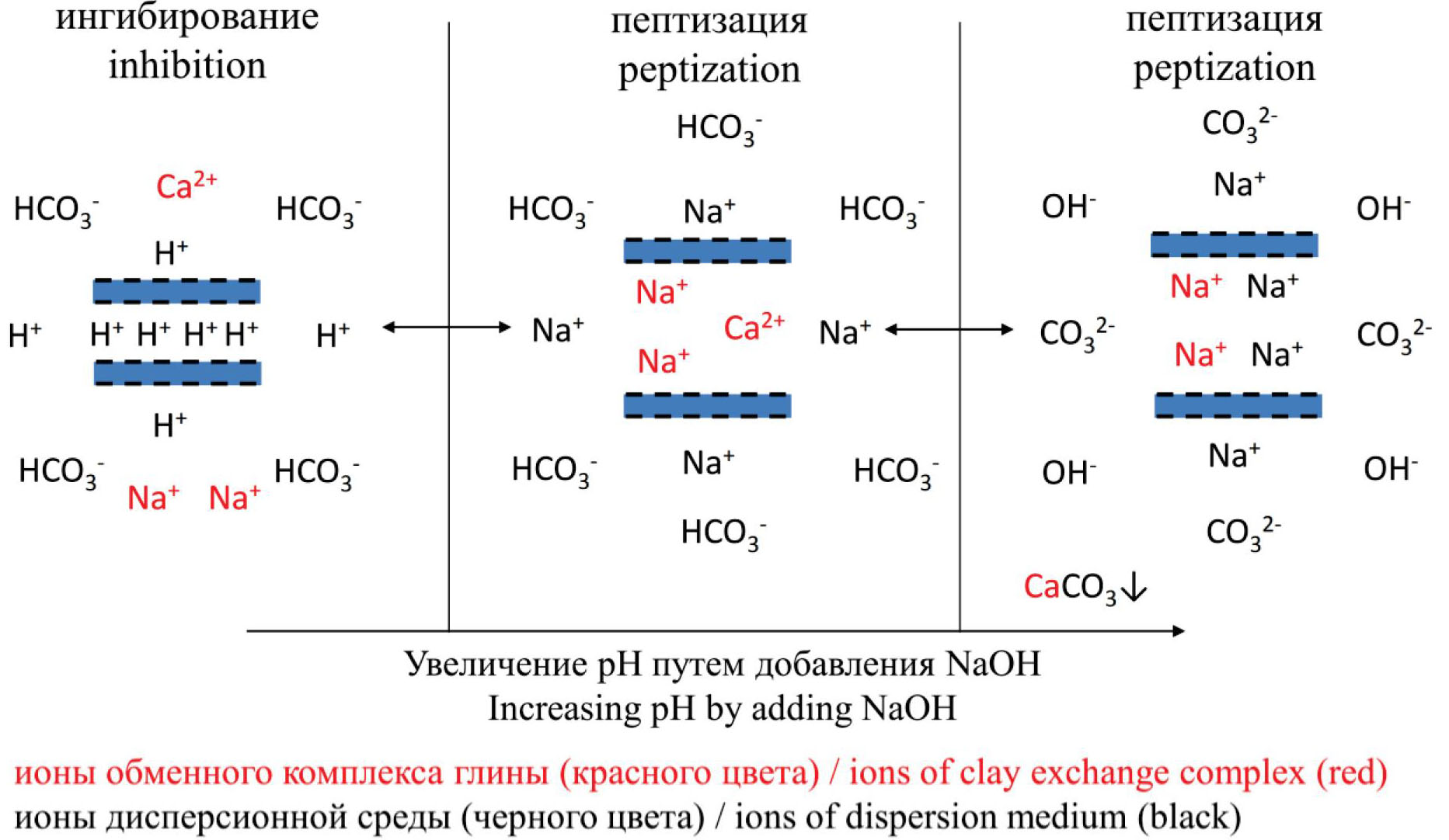 Также следует отметить, что поскольку при диссоциации Н2СО3 одновременно с коагулирующими ионами H+, располагающимися в межпакетном пространстве глин, в дисперсионной среде находятся пептизирующие бикарбонат-ионы HCO3–, процессы ингибирования и пептизации глины идут одновременно. Вид превалирующего процесса зависит, соответственно, от концентрации угольной кислоты и растворенных бикарбонат-ионов, находящихся в воде в равновесии с другими катионами, отличными от H+. Следовательно, при повышении pH системы количество растворенных бикарбонат-ионов будет увеличиваться и это будет приводить к пептизации глины.