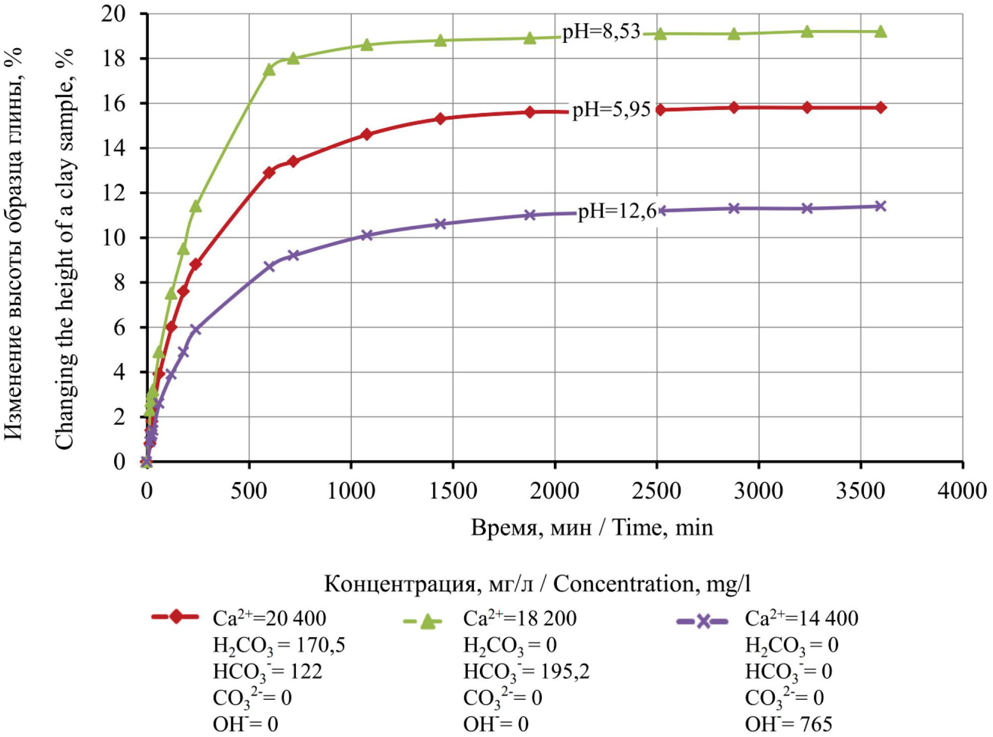 Из графических зависимостей, иллюстрирующих динамику набухания глинистого образца в водах, содержащих ионы Ca2+, эквивалентная концентрация которых меньше концентрации угольной кислоты, бикарбонатов и карбонатов, видно, что в присутствии двухвалентных катионов возможно прогрессирующее набухание глины.