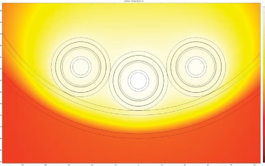 Для кабелей, проложенных треугольником, имеет место другая картина распределения температурного поля. Так как кабели касаются друг друга в двух точках, процессы теплопередачи будут проходить интенсивнее. В соответствии с ПУЭ данный способ прокладки возможен, а значит необходимо рассмотреть и его.
