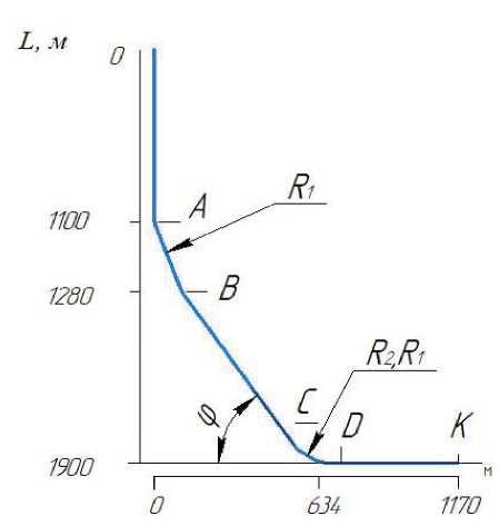Проектная глубина скважины включает в себя направление диаметром 324 мм, глубиной 100 м; кондуктора диаметром 245 мм, длиной 750 м; участка первого набора кривизны i=1,5°/10 м с отметки 1100 м по вертикали; 146-мм эксплуатационной колонны, которая имеет интервал стабилизации примерно до отметки 1856 м по вертикали; двух (или одного) участков набора кривизны при входе в горизонтальный пласт с интенсивностями соответственно 6°/10 м и 3,5°/10 м с отметок 2082 и 2274 м по длине колонны (рис. 1).