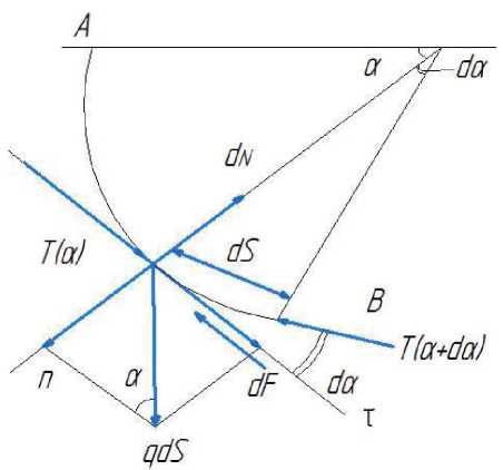 Рассмотрим участок первого набора кривизны и действующие усилия (рис. 2). Выделим элемент колонны dS и рассмотрим действующие силы: Т(а) – усилие сжатия колонны; qdS – вес элемента колонны; dS – элемент дуги колонны; q – вес длины погонного метра; dF – элемент силы сопротивления; dN – нормальная составляющая веса участка dS.