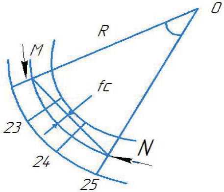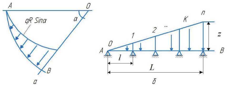 При большом радиусе кривизны R>200 м колонну на отрезке кривизны АВ длиной π/6 (рис. 3, а) можно рассматривать как прямую круглую балку, загруженную неравномерно распределенной нагрузкой (эквивалентная треугольная нагрузка на рис. 3, б).