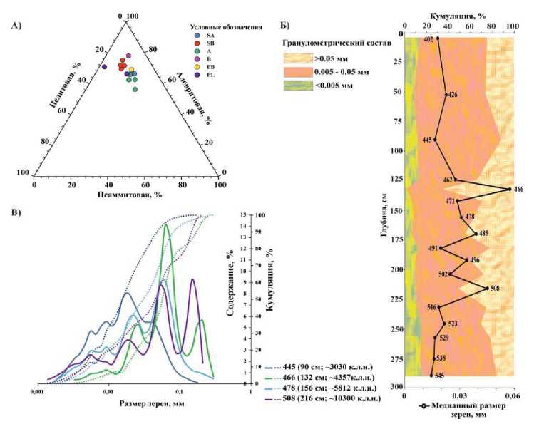 Рис. 1. А) треугольная диаграмма, отображающая распределение гранулометрического состава (пелитовая фракция, %; алевритовая фракция, %; псаммитовая фракция, %); Б) распределение гранулометрического состава (Md, мм; глина, %; алеврит, %; песок, %); В) примеры графиков распределения содержания зерен по размеру частиц (гистограмма (сплошная линия) и кумулятивный график (пунктирная линия)) для образцов № 445 (суглинок алевритовый), № 478 (супесь алевритовая), № 508 (суглинок) и № 466 (алевритовый песок)