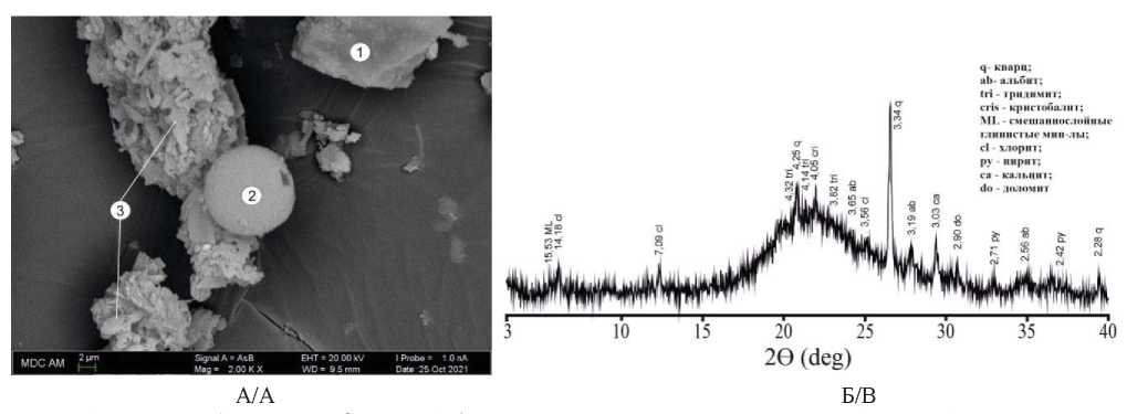 Рис. 2. Минеральный состав осадков оз. Сабакты на примере интервала 90 см (~3030 к.л.н.): А) электронно-микроскопические снимки: обломочный кварц – энергодисперсионный спектр (1), стоматоцисты, на врезках – энергодисперсионный спектр (2), панцири диатомей (целые створки и фрагменты) (3); Б) дифракционный спектр минерального состава осадков с выраженной рентгеноаморфной фазой (86 см; ~2940 к.л.н.)