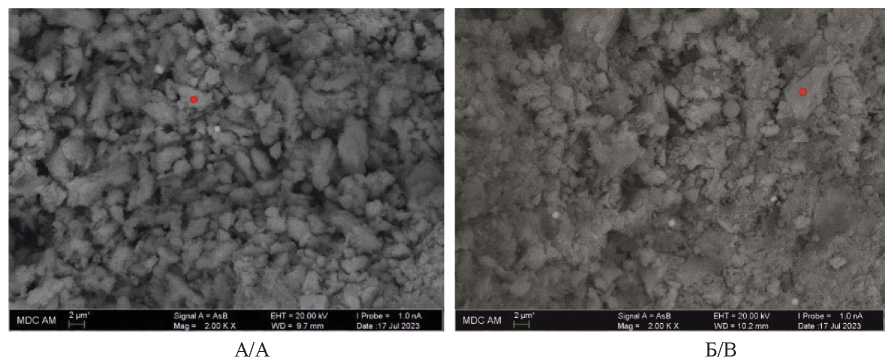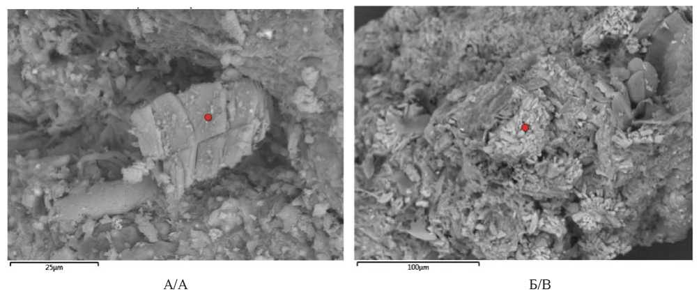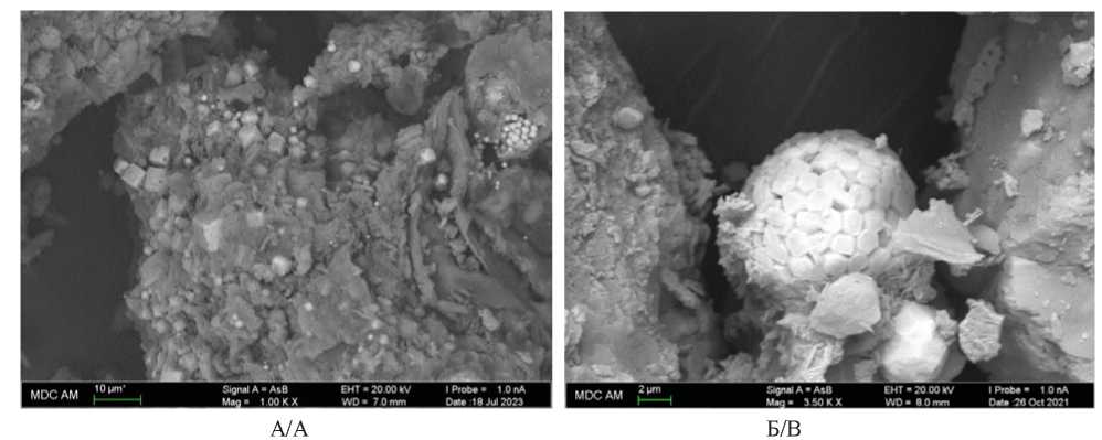 Рис. 5. Электронно-микроскопический снимок кальцита, 154 см, ~5700 к.л.н.: А) атом. % Ca – 8,69, Mg – 0,47; O – 38,87, C – 50,87; Mn – 0,05, Si – 0,44; Al – 0,24, S – 0,23, Fe – 0,08; Б) атом. % Ca – 10,86, Mg – 0,65; O – 61,53, C – 25,70; Sr – 0,03, Si – 0,64; Al – 0,23, S – 0,21, Fe – 0,11