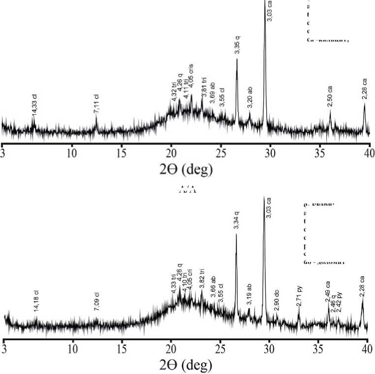 Рис. 4. Дифрактограммы донных отложений оз. Сабакты: А) отметка 46 см (~1372 к.л.н.); Б) отметка 166 см (~6472 к.л.н.)