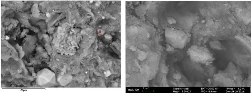 Кальцит, содержащий в примесях Mg, Mn и Sr, по данным СЭМ установлен в виде блочных кристаллов с размером зерен <10 мкм (рис. 5).